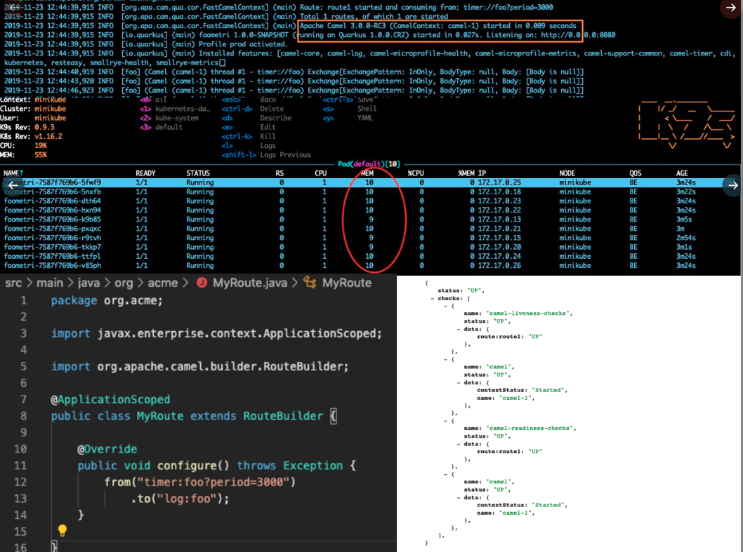 All this optimization improves the startup performance of Camel and reduces the memory overhead. With Camel Quarkus you can natively compile your Camel application and make it startup in 30 milli seconds and consume only 10mb of memory (RSS) with a full blown HTTP REST server and health-checks and metrics.